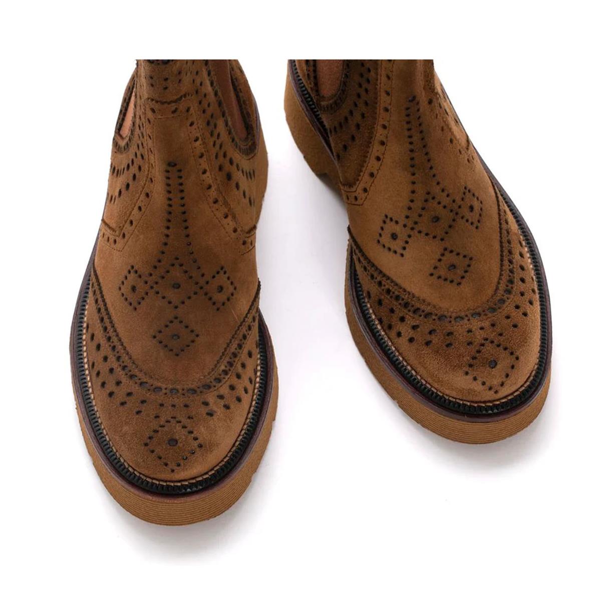Jimmy platform Chelsea botlar, taba rengi süet deriden el yapımı. Yan elastik bantlı. Kolay giyip çıkarmak için arka çekme tırnağı. Dekoratif delikler. Uyumlu renkte ultra hafif taban. Platform yüksekliği 4,5 cm.