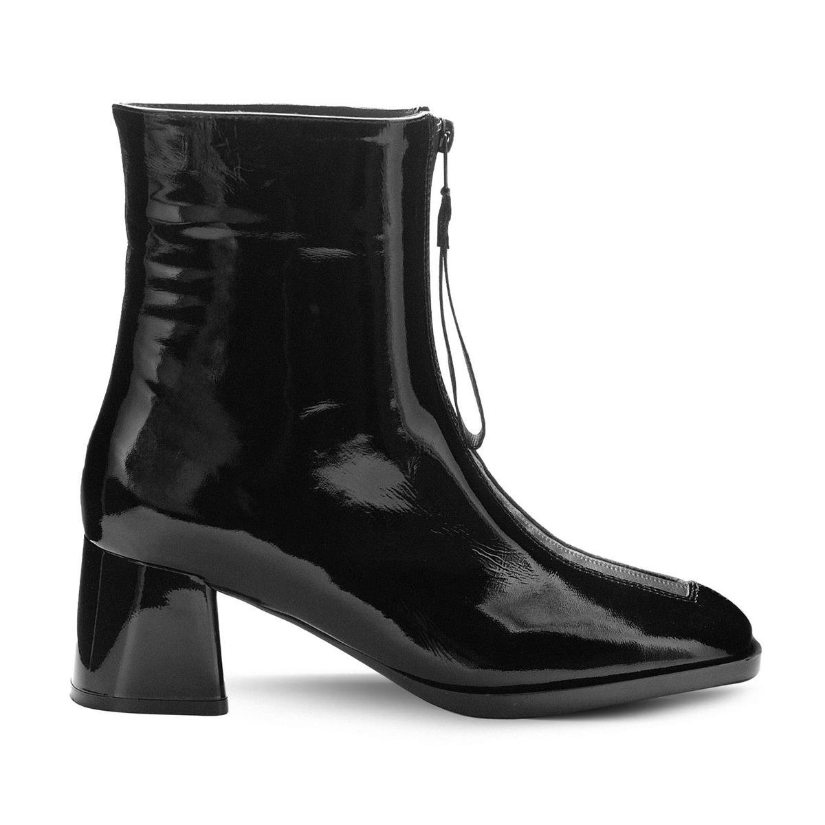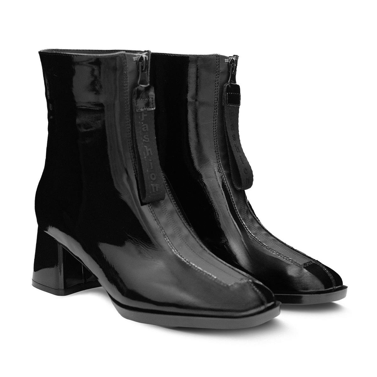 Bu bot, %100 parlak deri malzemesiyle kalitesini ortaya koyuyor. Kare burun yapısıyla rahat bir kullanım sunar. Hem iç tabanı deri olduğu için konforludur hem de kauçuk tabanıyla dayanıklılık sağlar. Pratik bir kullanım için önden fermuarlıdır. 6 cm'lik topuk yüksekliğiyle şık ve rahat bir duruşa sahiptir.